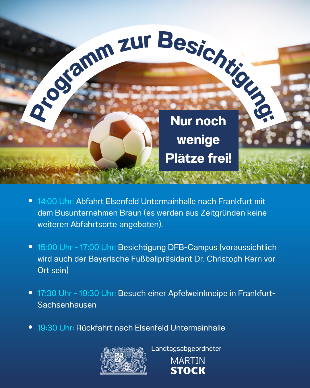 Der Landtagsabgeordnete Martin Stock (CSU) lädt ehrenamtlich engagierte Mitglieder der Sportvereine im Landkreis Miltenberg zu einer Informationsfahrt zum DFB-Campus nach Frankfurt ein. Die Fahrt findet am Dienstag, 10. März 2026, statt.
